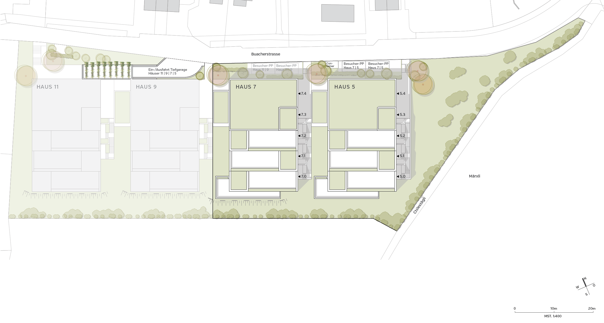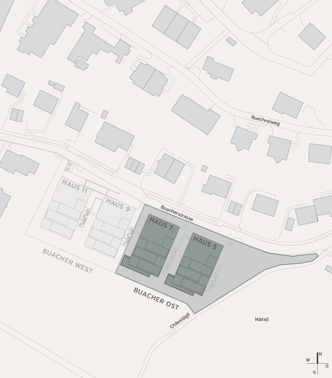 Auf zwei Parzellen – Buacher West und Ost – entstehen vier Terrassenhäuser mit insgesamt 18 grosszügigen und sonnigen 4½- und 5½-Zimmer-Terrassenwohnungen. Die beiden auf dieser Webseite vorgestellten Häuser (Haus 7 und 5) mit je fünf Terrassenwohnungen befinden sich auf der östlichen Parzelle, angrenzend an die Landwirtschaftszone.